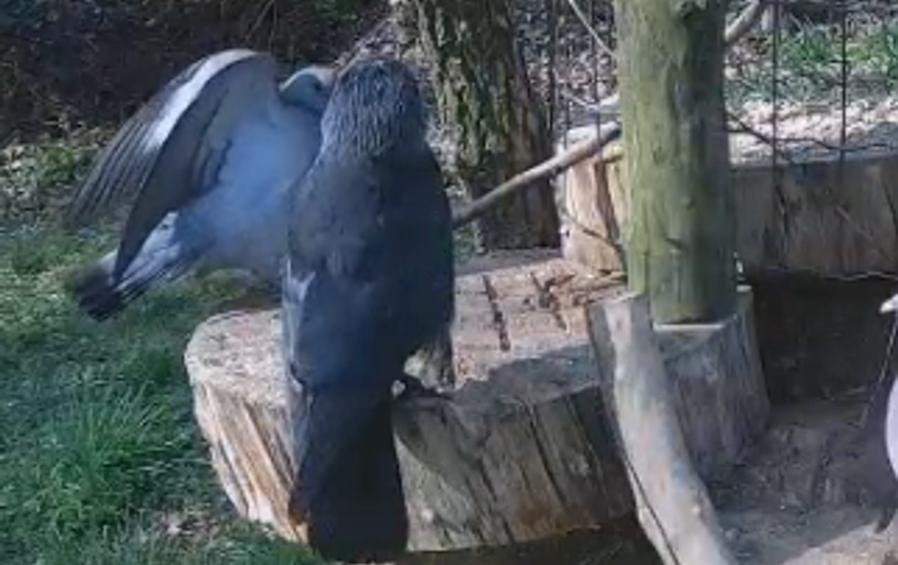Een kleine onenigheid tussen twee holenduiven en een kauw.