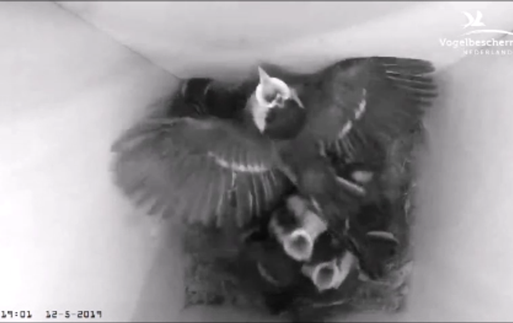 Om te oefenen is het nest een beetje aan de krappe kant, maar omdat koolmeesjes zo licht in gewicht zijn merken de broertjes en zusjes er niks van als er iemand op hun rug springt. Er zal hoe dan ook nog even flink getraind moeten worden. Tijdens voeren komen de ouders nog vaak binnen, maar de overdracht is ook regelmatig vanaf het invlieggat