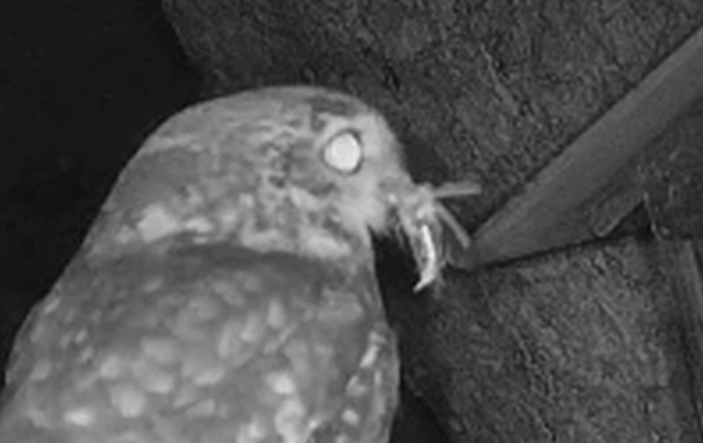 Man steenuil komt met een keverachtig insect aanzetten. Vast nog geen meikever.