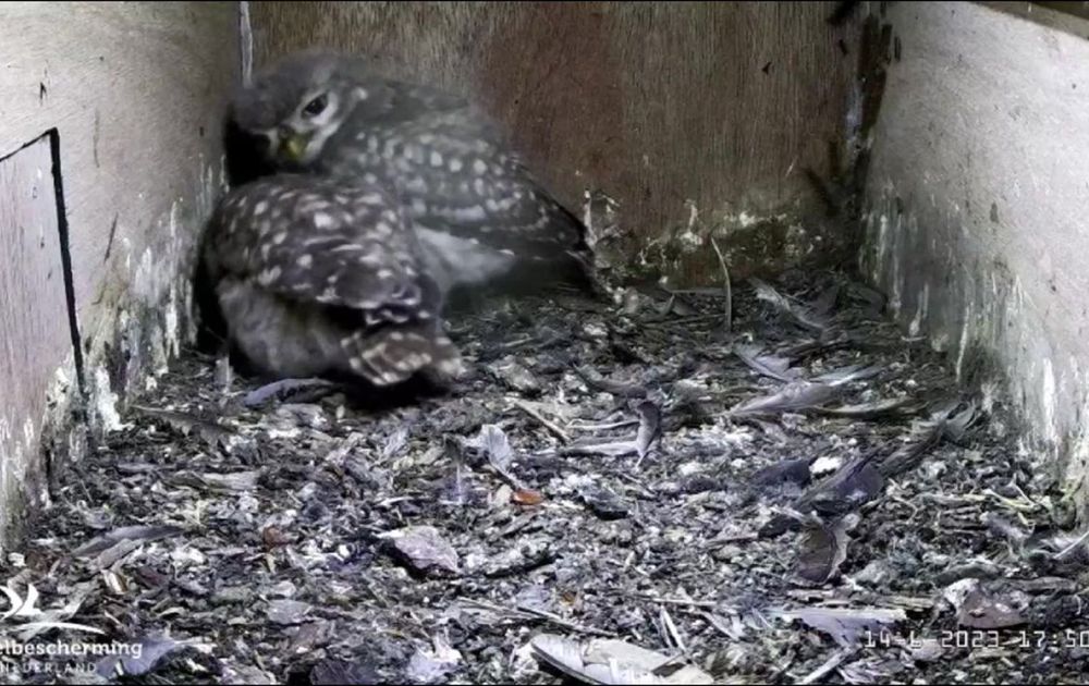Kuiken één heeft een voorraadmuis uit de sluis gehaald en gaat de muis opeten achterin de nestkast. Achtereenvolgens komen kuiken 2 en kuiken 3 binnen. Eén van de drie zal uiteindelijk de muis opeten.