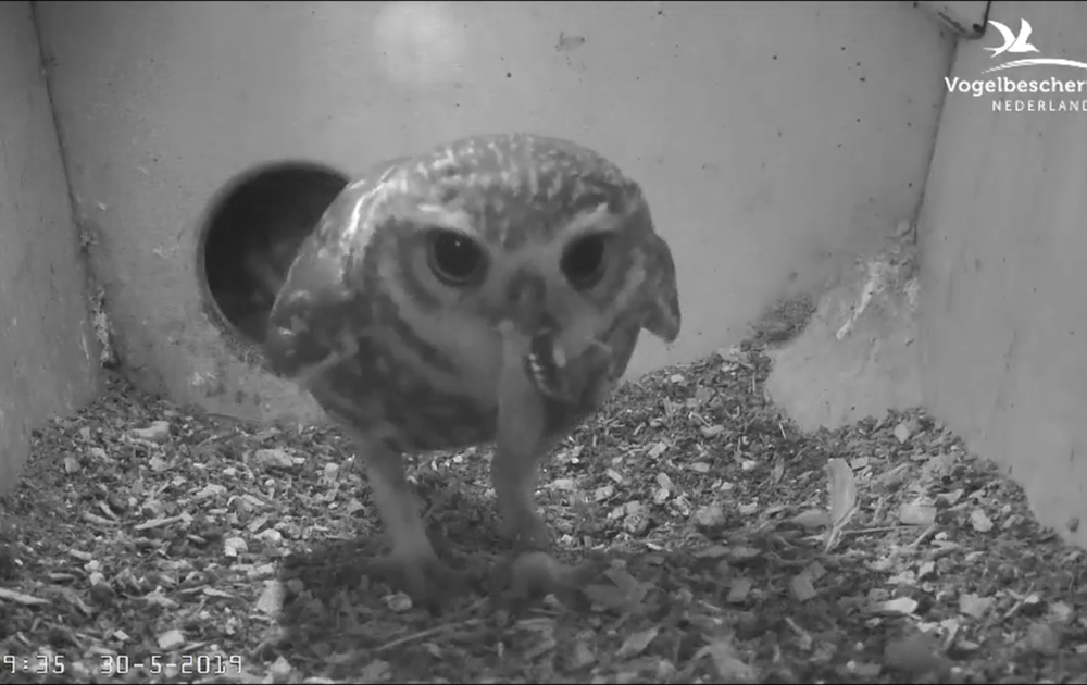 Man steenuil kan een meikever niet kwijt aan het kuiken dat in het vlieggat zit en niet aan het het kuiken in de nestkast. Hij gaat met de kever heen en weer en raakt de kever in de sluis kwijt.