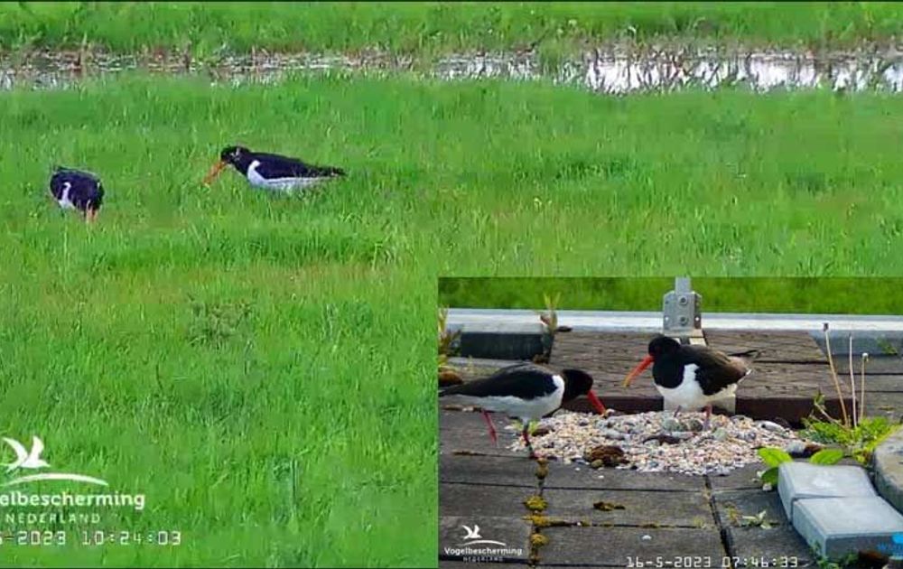 Twee scholekster nesten, een op het land en een op een dak.