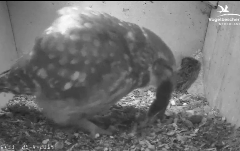 Man steenuil brengt vroeg in de morgen een grote woelmuis en een kleine woelmuis. Vrouw eet de kleine gelijk op. De andere woelmuis verdwijnt in de loop van de morgen in vrouw steenuil.