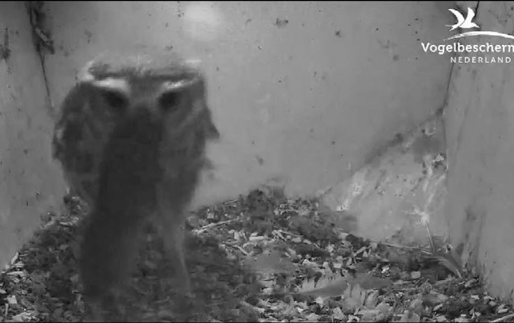 Man steenuil brengt een woelrat aan broedende vrouw. Zij eet de woelrat in 2 etappes op. Een woelrat is geen echte rat maar hoort bij de soortgroep woelmuizen net zoals de rosse woelmuis, de gewone veldmuis en de muskusrat. Kenmerkend zijn de donkere vacht, de betrekkelijk lange staart en het forse postuur. Maar dit is een vrij klein exemplaar....... Locatie Winterswijk