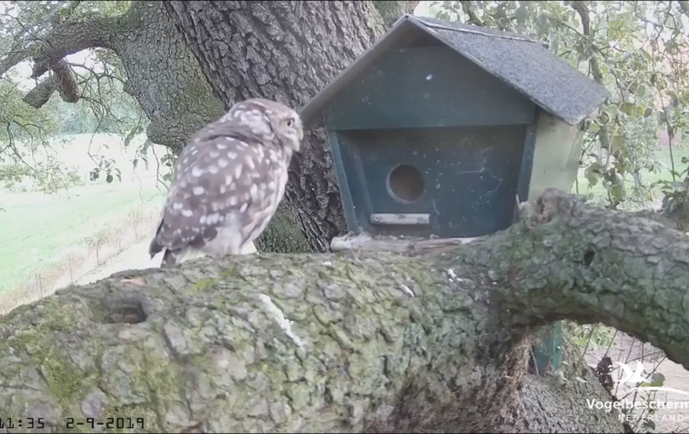 Vrouw steenuil komt uitrusten van de nacht. Ze roept en gaat onder begeleiding van een kauw de nestkast in. Bij vertrek twee uur later, komt een holenduif haar begeleiden.