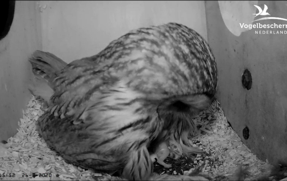 Vanavond kroop het eerste kuiken van de bosuilen uit het ei.