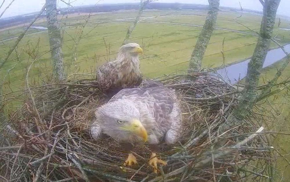 Het paar Zeearenden in de Alde Feanen in Friesland dat vorige jaar twee jongen grootbracht is al sinds de herfst weer bezig nieuwe takken naar hun oude nest te brengen. Het nest is flink gegroeid en ziet er stevig uit. Nog steeds voert het paar takken aan om de rand te versterken en gras om een fijne zachte nestkuil te maken. Regelmatig staan ze op het nest uit te kijken en ze gaan vaak even proefzitten. Betekent dat ook dat er al snel een ei gelegd gaat worden?
