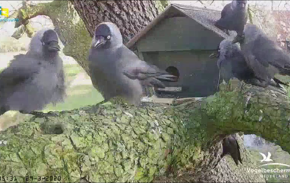 De buurtkauwen verzamelen zich voor de nestkast van de steenuilen.