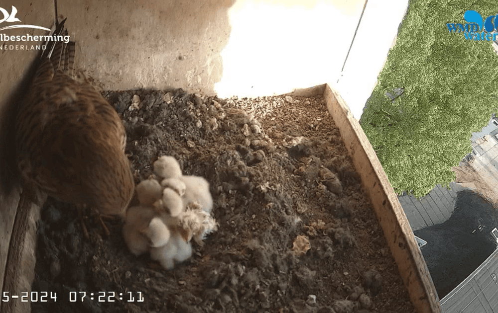 Veilig en warm onder moeder torenvalk en wachten maar op de (vele) prooien die vader komt afleveren.