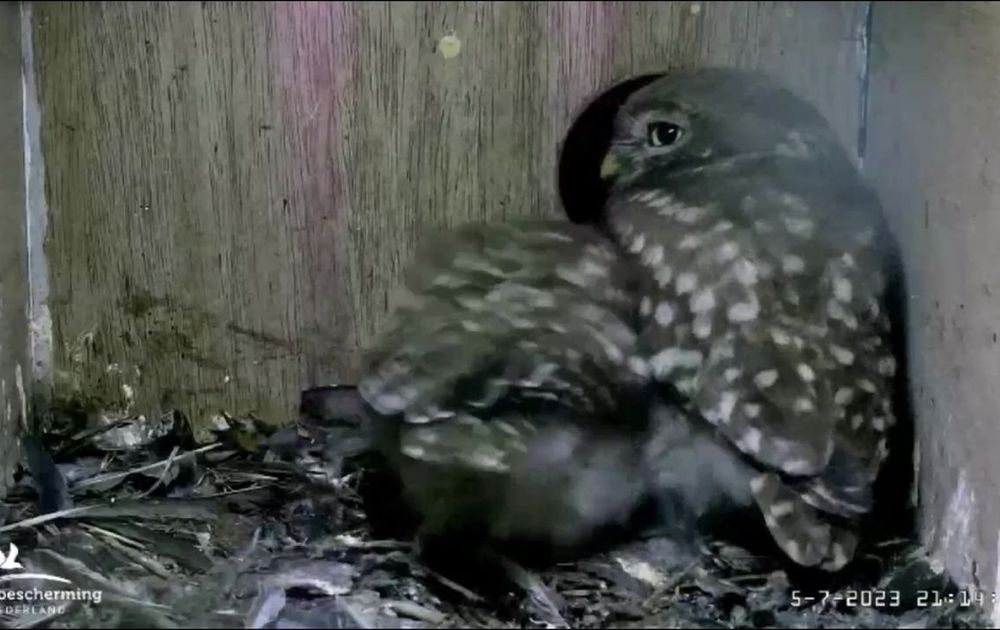Eén jonge steenuil gaat de nestkast uit, de andere jonge steenuil weet niet wat hij/zij moet doen.