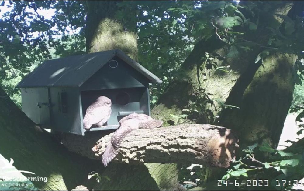 Jonge steenuilen op de tak voor de nestkast. Alle vier de jongen komen in beeld.