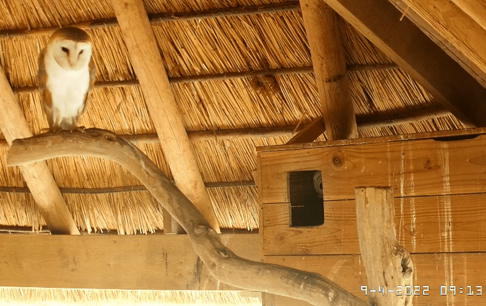 De uilen krijgen onverwacht bezoek, voor ons kijkers een mooie gelegenheid om vrouw uil bij daglicht te bewonderen.