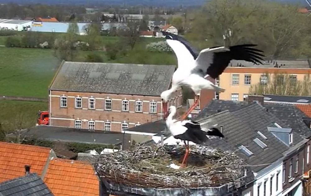 Het vestingstadje Gennep is al jaren de favoriete broedplek van een paartje ooievaars. De schoorsteen op het stadhuis biedt een ideale plek met uitzicht, een vrije aanvliegroute en weilanden vlakbij.