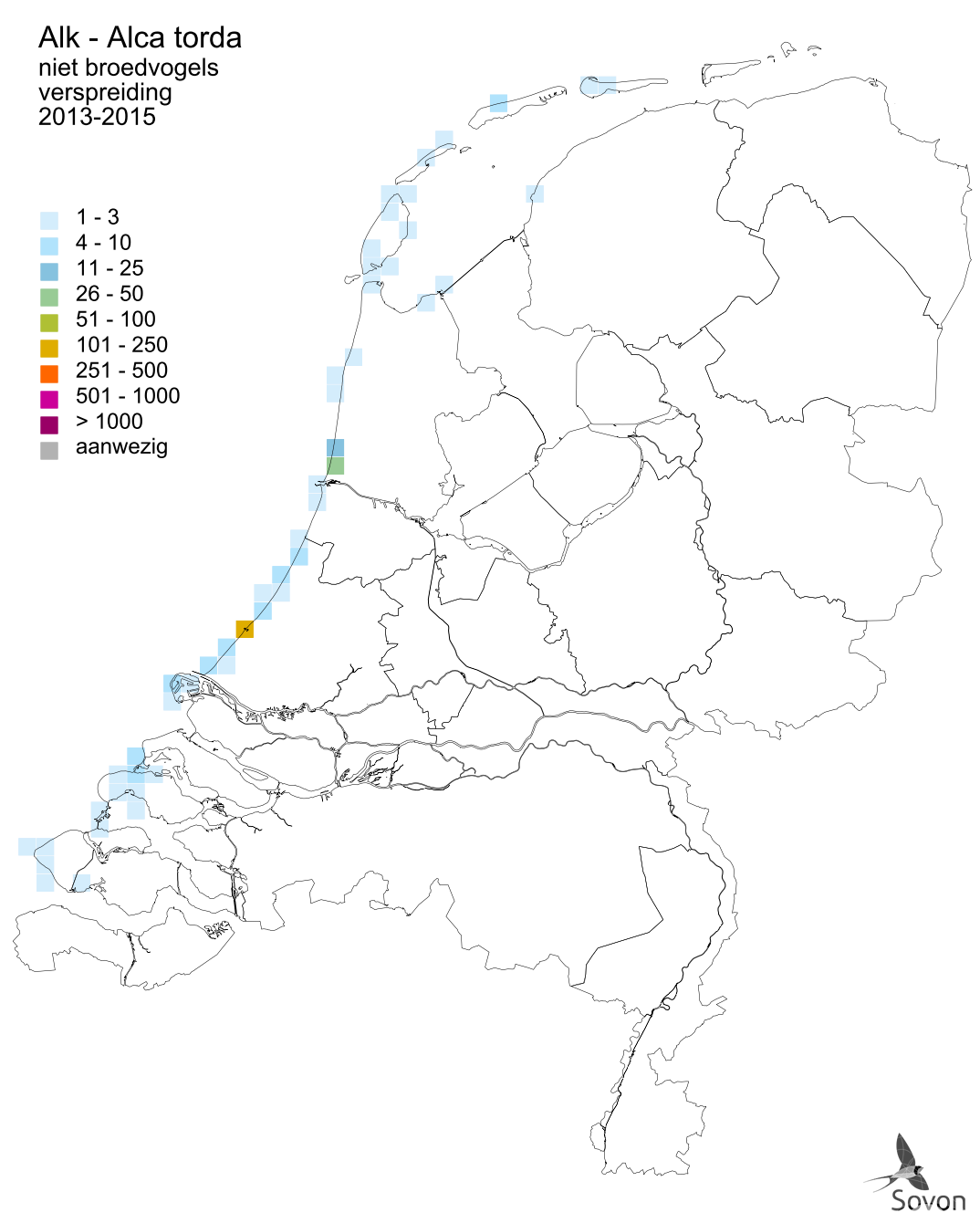 Jaarlijks kleine aantallen langs de kust. In sommige jaren (2007, 2012) grotere aantallen door weersomstandigheden ten noorden van Nederland. Door overbevissing en vervuiling van olie-industrie gaat het op internationaal niveau niet goed met de alk.