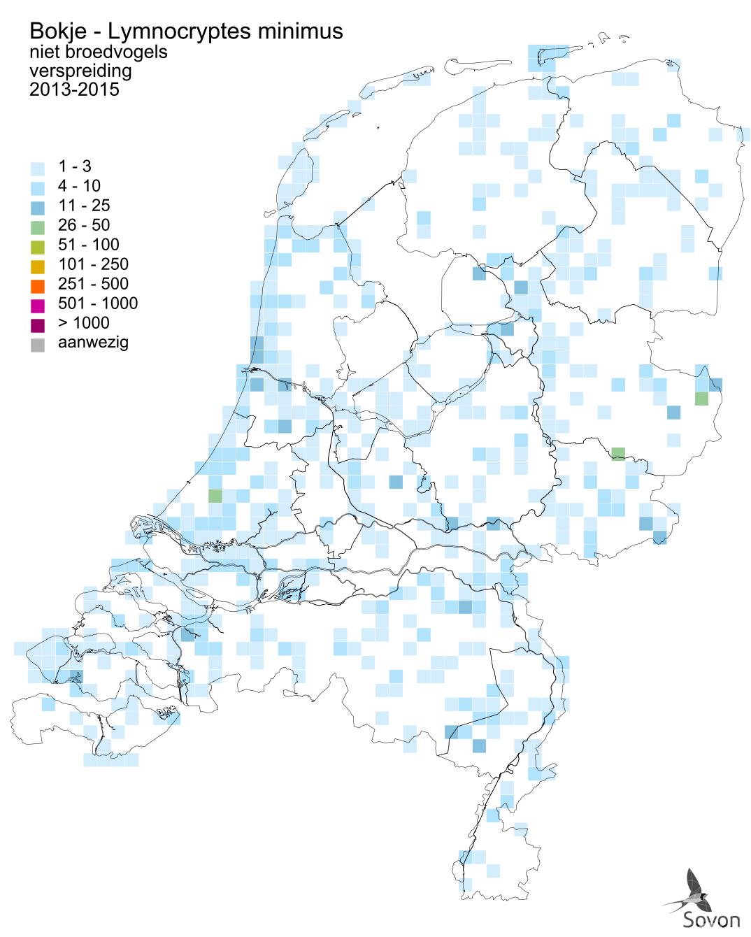 Het bokje is de kleinste snip. Bij verstoring vertrouwt hij volledig op zijn camouflage, waardoor je hem meestal pas ziet als je er bijna op staat. Als er vorst is, zijn er betere kansen om hem te zien: in kwelslootjes. Het is geen zeldzame vogel, die op doortrek en in de winter bij ons wordt gezien.