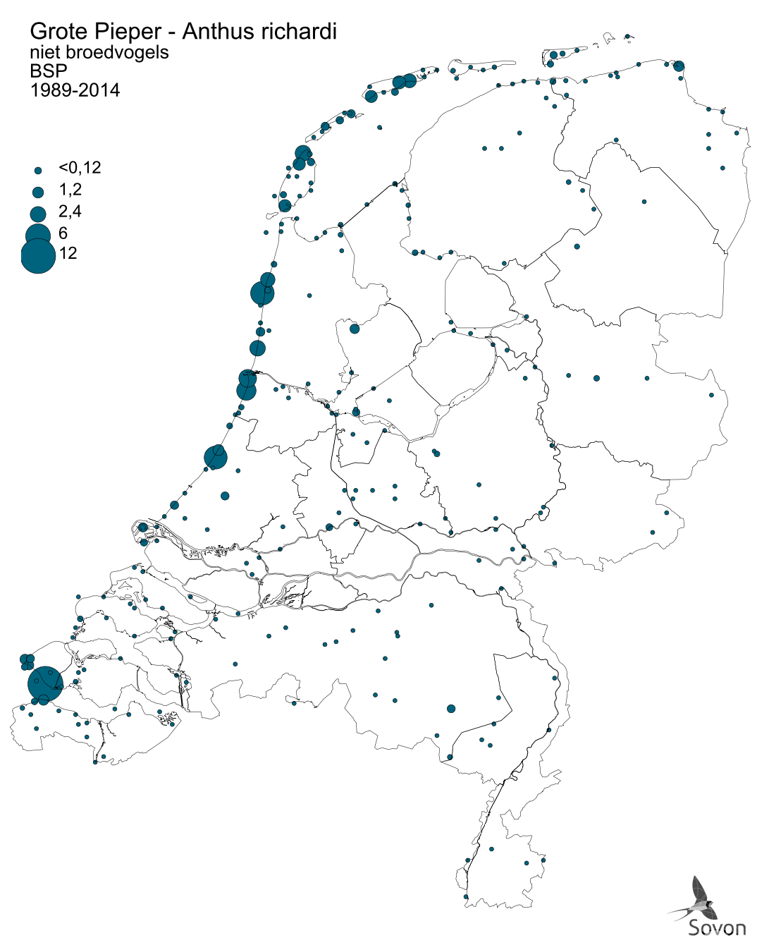 Vooral tijdens najaarstrek, duikt dan verspreid langs de Nederlandse kust op. Meeste kans op een overtrekkende grote pieper in de zeereep.