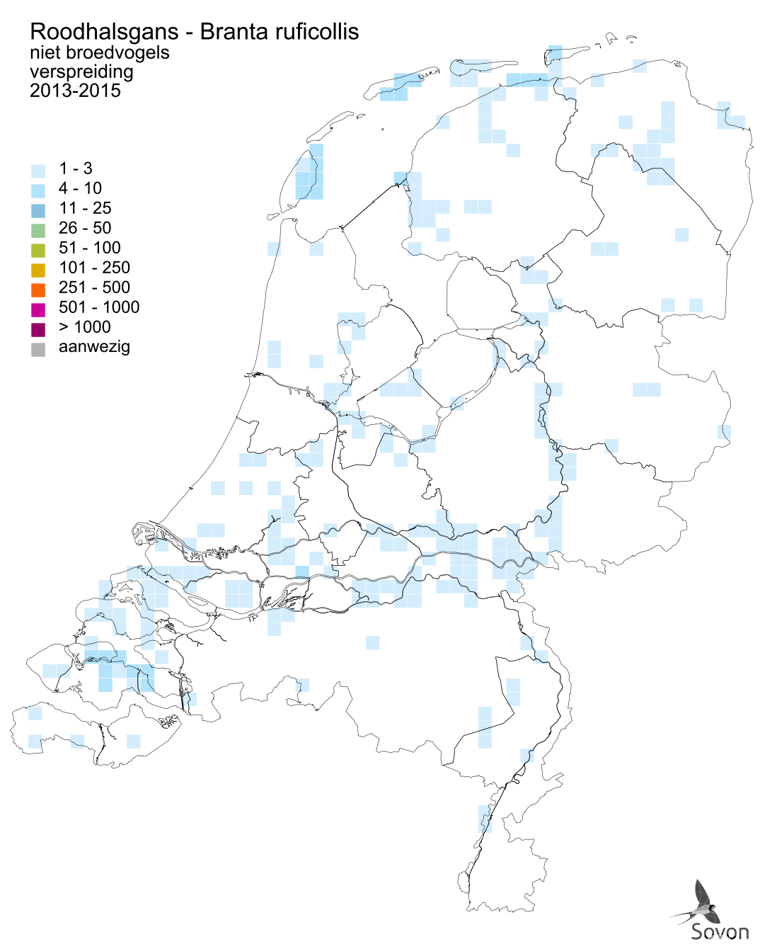 Over de laatste decennia bekeken neemt het aantal waarnemingen van roodhalsganzen in de winter licht toe.
