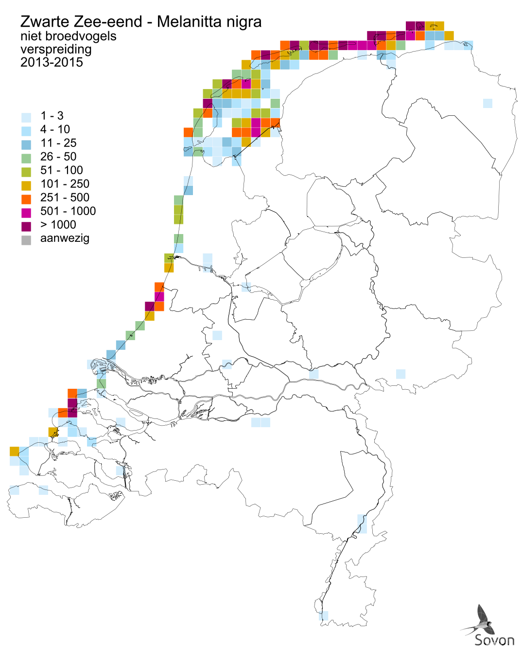 Zee-eenden zijn sinds de jaren tachtig fors afgenomen voor de Nederlandse kust. Voor grote aantallen zwarte zee-eenden in het voorjaar moet je tamelijk ver terug in de tijd. In de periode 1993-1997 werden er soms vele tienduizenden gezien bij Camperduin (NH), tot wel 96.000 exemplaren. Die aantallen werden ook in het voorjaar geteld, maar aanmerkelijker vroeger in het jaar dan nu, in maart en april. In januari 2011 werden ten noorden van de Waddeneilanden vanuit een vliegtuigje 31.000 zwarte zee-eenden geteld; een opvallend hoog aantal vergeleken met de jaren ervoor tijdens midwintertellingen. In 2015 bevond zich een recordaantal voor de kust van Texel. Vermoedelijk hebben ze een nieuwe voedselbron aangeboord, nu het aantal strandschelpen door overbevissing sterk is teruggelopen.