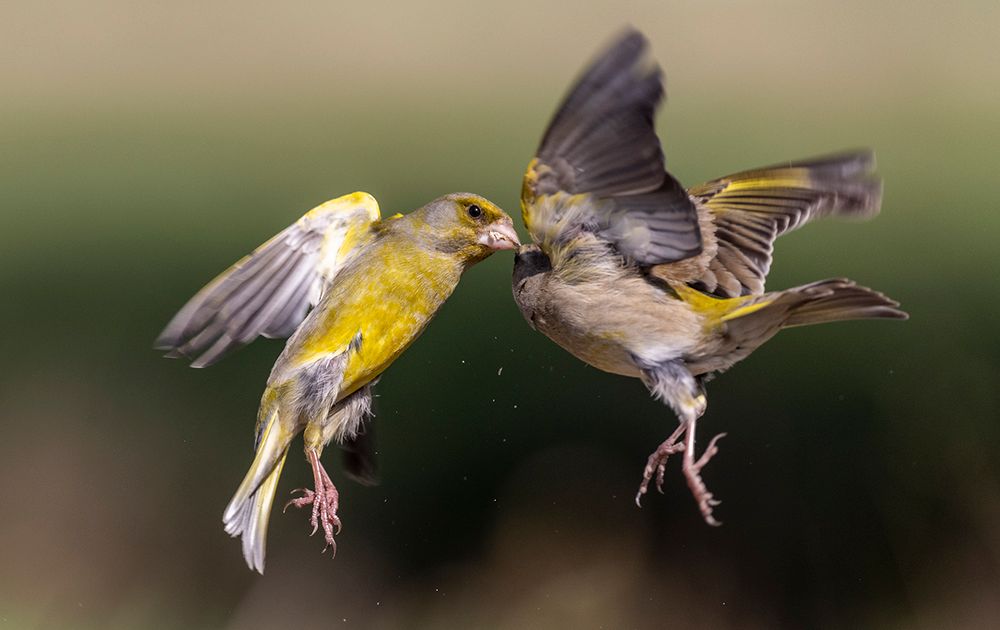 De mannetjes groenlingen willen graag met wat voer hun vrouwtjes verwennen. maar een ander mannetje mag niet in de buurt komen