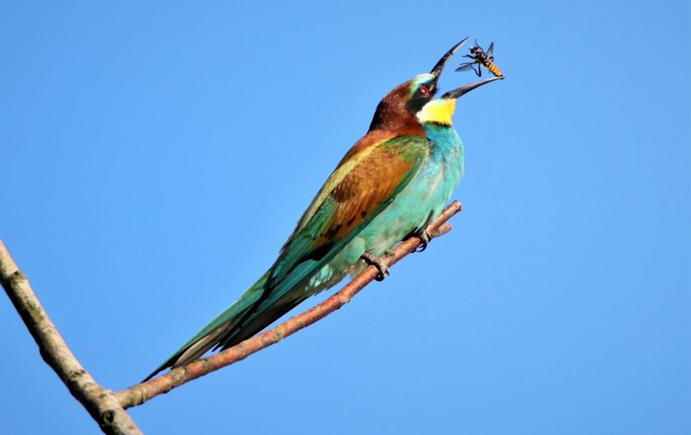 Bijeneter slaat het insect eerst dood tegen een tak en gooit hem omhoog in de goede richting om vervolgens op te eten