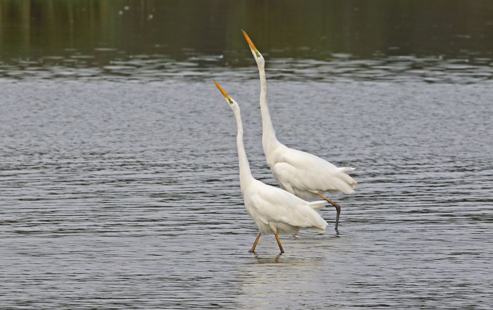 Verspreid over het gebied een stuk of zes vissende grote zilverreigers. Dan landt er een vlak bij een al aanwezig exemplaar en betwisten ze elkaar die visplek door indrukwekkend imponeergedrag. Zich zo groot en indrukwekkend mogelijk makend stappen ze statig naast elkaar voort, draaien, keren en geen van beide weten ze van wijken. Na een kwartiertje daalt de spanning, wordt de afstand groter, leggen ze zich bij de status qua neer en gaan ze door met vissen. Trefzeker, bijna na elke tien passen en er spartelt weer een zilverig glanzend visje, ter grootte van een pink tot middelvinger in de snavel. Hap, hap en het is weg. Welke passant vermoedt nog dat deze in hun jacht opgaande vogels elkaar even tevoren de ruimte niet gunden.