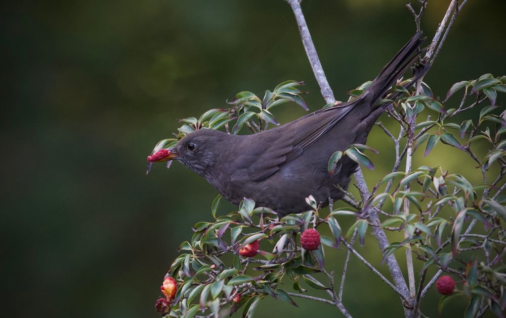 Merel snoept van de zoete bessen van de Japanse kornoelje.