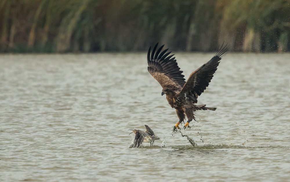 Jonge Zeearend slaat Wulp en verdriet de Wulp.