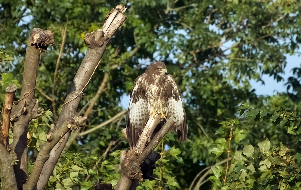 Een prachtig moment, ineens stond ik oog in oog met deze mooie buizerd. Hij schrok ook van mij en vloog weg naar de overkant van de straat om aldaar in een mooie tak van deze boom plaats te nemen. Heerlijk in het zonnetje, wat een mooi moment was dat. Ik mocht diverse foto's van hem/haar maken. Waarvan deze toch wel de mooiste is.