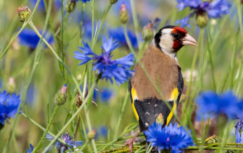 Voor het eerst na vele pogingen stond het weidemengsel op de akkerrand volop in bloei en voor het eerst spotte ik deze mooie kleurrijke vogels. Wat is er nu mooier dan een distelvink vast te leggen tussen de mooie bloeiende korenbloemen.