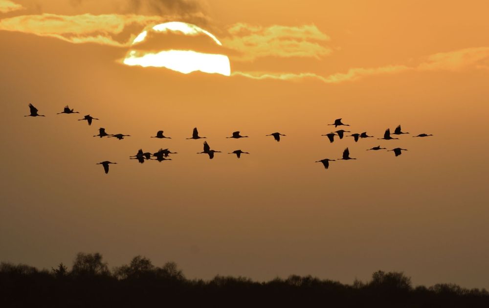 Vanuit en vogelhut genomen bij ondergaande zon. Kraanvogels op zoek naar een slaapplek