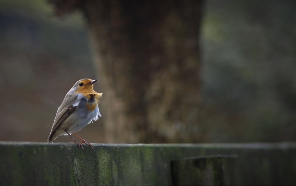 De wind waait stevig. De veertjes van het roodborstje waaien alle kanten op.