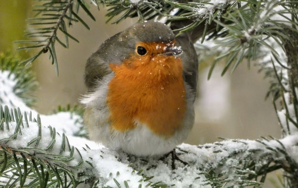 Toen in februari eindelijk weer eens sneeuw viel en onze tuin mooi wit kleurde, ging het roodborstje mooi voor mij poseren in de besneeuwde kerstboom