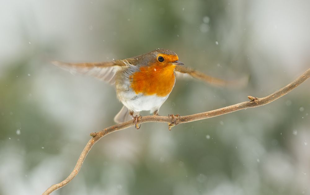 In een sneeuwbui kwam de roodborst naar de voedertafel. Een dagelijkse gast in onze tuin. Hier staat hij/zij op het punt om weg te vliegen. Het lijkt wel of hij/zij even met haar vleugels wappert voor de vlucht.