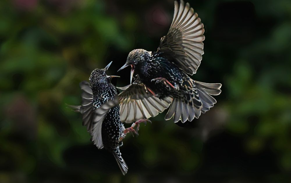 De spreeuwen maken ruzie oom het eten en vliegen dan in tweetallen door de lucht. Vaak met open snavels en met uitgestoken poten.