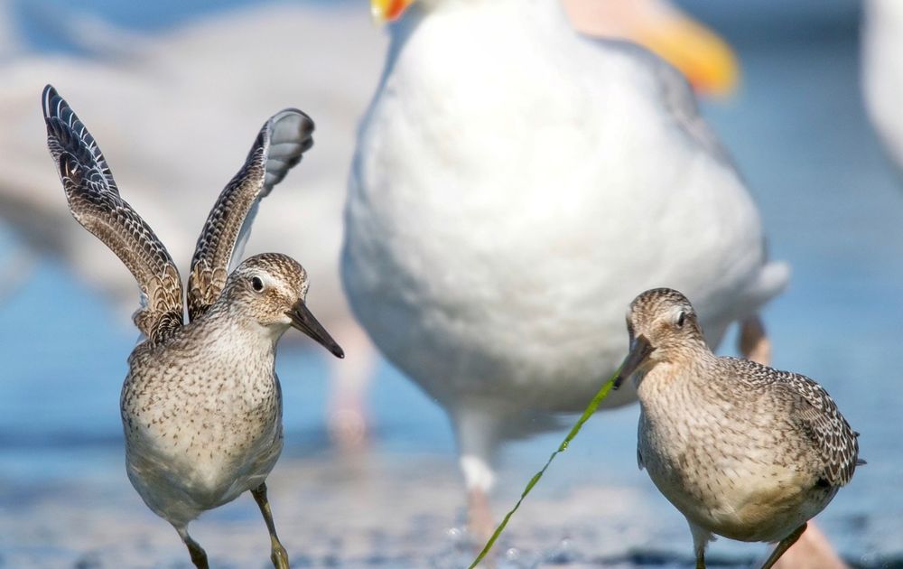 Deze twee Kanoeten waren op zoek naar voedsel op de pier. Nog net voordat er een Zilvermeeuw van achteren komt aanlopen vliegen en sprinten ze weg. Een Kanoet heeft nog net een stukje wier kunnen meenemen!