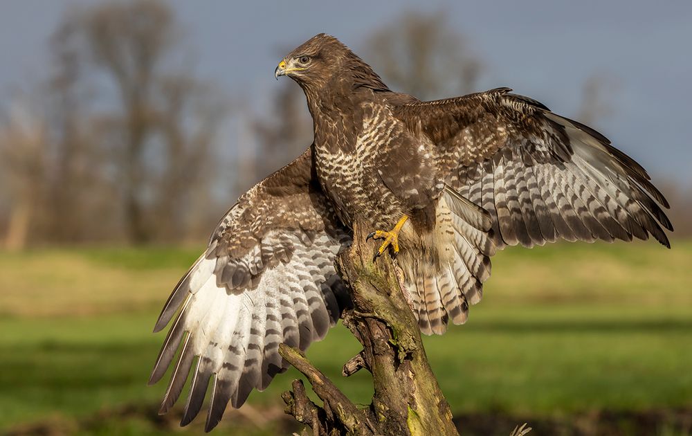 Waarschijnlijk omdat er een andere buizerd in de buurt was ging deze er even breeduit voor zitten.