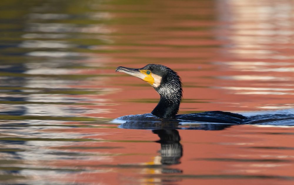 De Aalscholver zwom net in het rood van het dak van een huis dat stond aan de rand van het water.