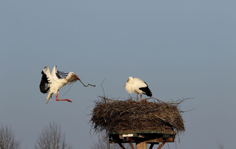 Ooievaar komt aan vliegen met nestmateriaal