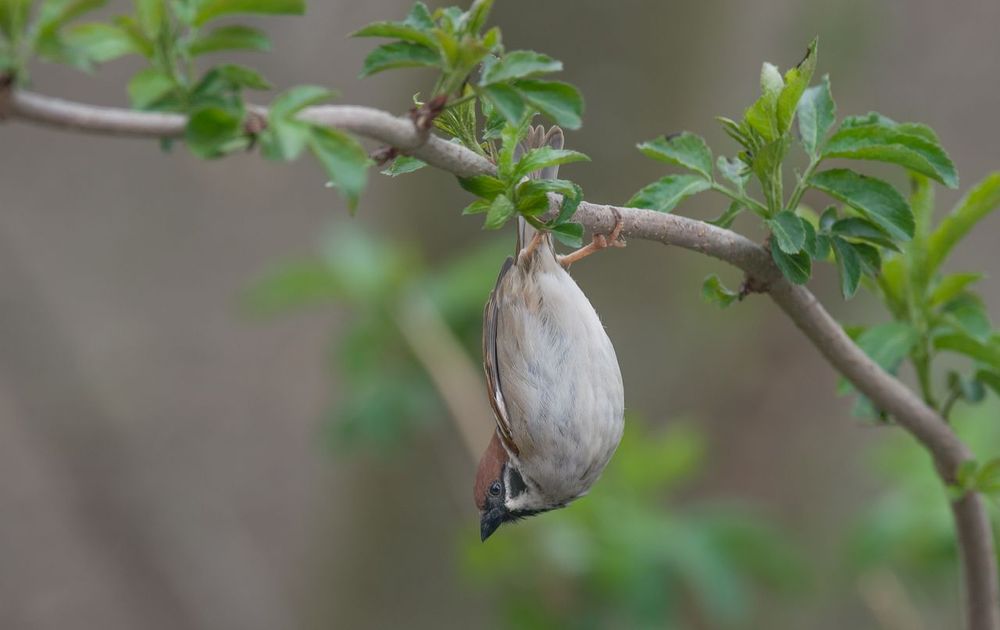 Dit ringmusje greep mis bij de landing op deze tak en kwam even ondersteboven te hangen. Het leverde mij dit bijzondere plaatje op.