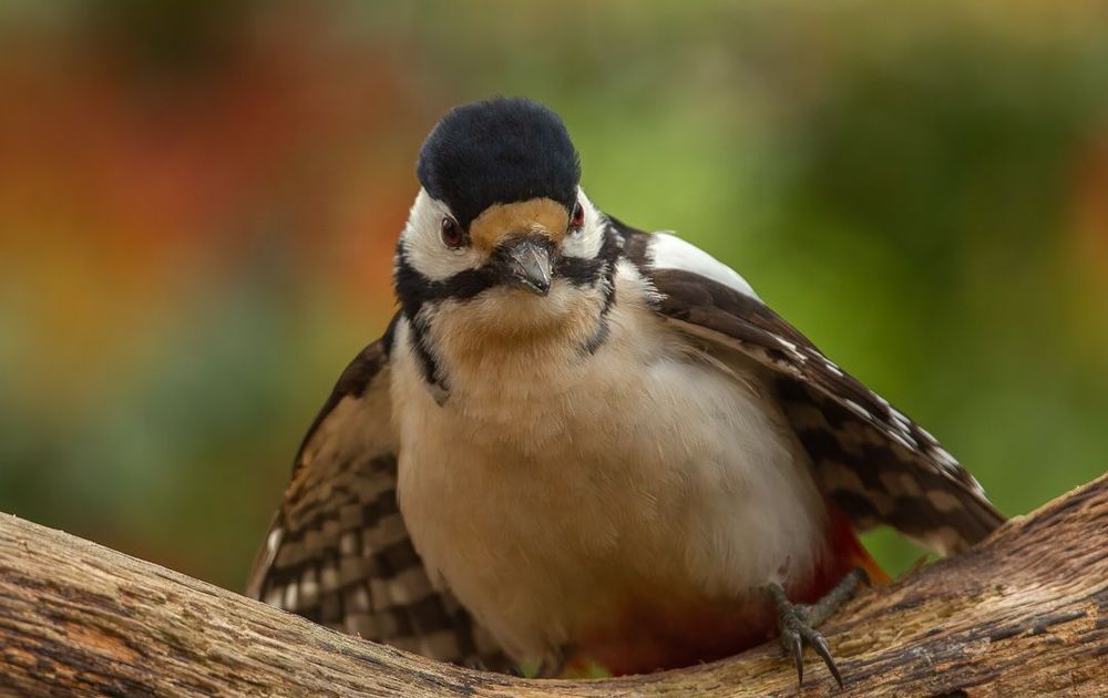 De grote bonte specht zat het eerst op deze stronk in de buurt van de voedertafel. Maar toen kwamen de spreeuwen....en dat vond de specht niet leuk. Hij nam een hele boze houding aan (nog nooit zo gezien). De spreeuwen waren denk ik ook onder de indruk....want ze taaiden snel af!