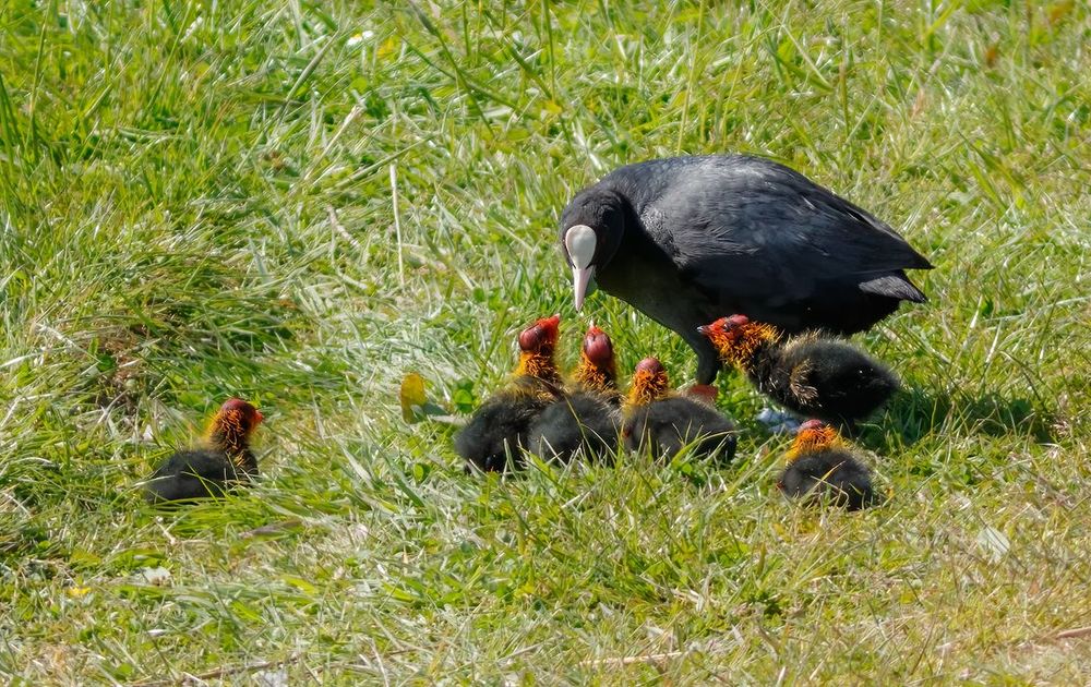 Ik zat in mijn auto op "jacht" naar Rietvogels, toen plotseling deze Meerkoet met haar 6 jongen vanuit het water de kant kwam oplopen en mij volkomen negerend haar kroost begon te voeden. Bijzonder moment weer.