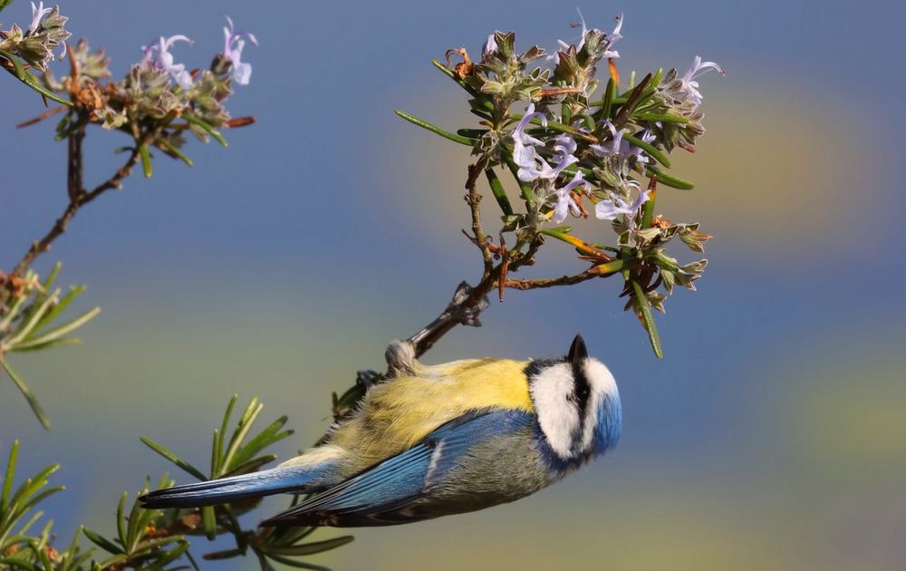 De Pimpelmees zoekt in het broedseizoen naar extra eiwitten. De struiken in de tuin worden goed doorzocht op rupsen, spinnen en ander lekkernij. In deze rozemarijnstruik vond de Pimpelmees uiteindelijk een spin. Knap werk, maar dat is zijn specialisatie, de zoektocht naar eiwitten.