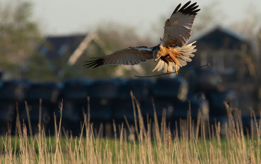 Elk jaar komt de bruine kiekendief broeden in dit gebiedje. Toen ik op afstand stond te posten, kwam man kiekendief met een tak aanvliegen voor het nest.