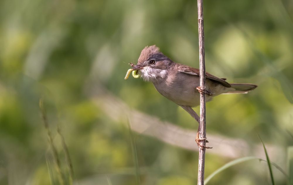 Enige tijd deze grasmus kunnen volgen bij zijn jacht op rupsjes en insecten.