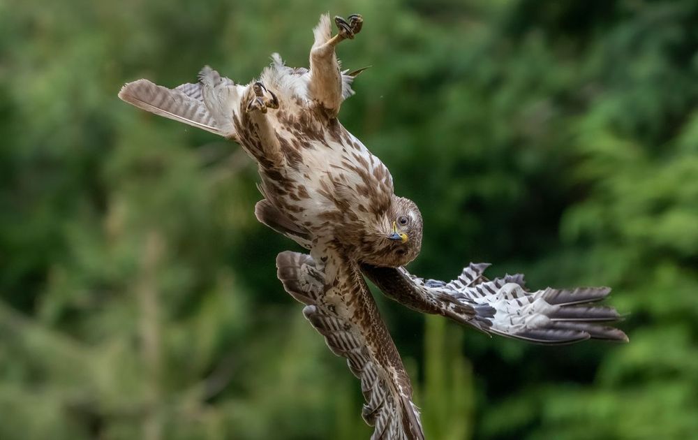 Deze buizerd werd door een soortgenoot aangevallen. De moment van opname laat zien hoe wendbaar buizerds kunnen zijn, want hier hangt hij letterlijk volledig onderste boven.