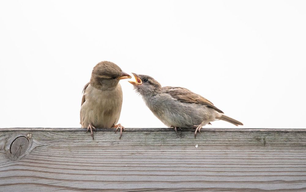 De uitvliegende mussen zijn nog altijd aan het roepen om voedsel. Heel aandoenlijk dan ook om te zien hoe de ouders ze op onze schutting voederen.