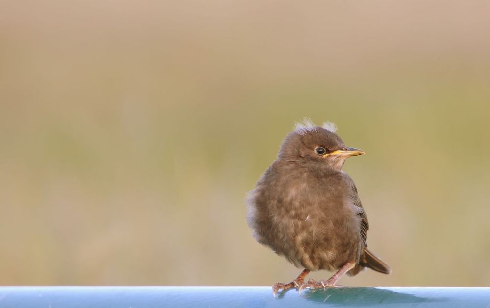 In het laatste avondlicht kwam dit jonge spreeuwtje spontaan naar me toegevlogen... het schattige donshaar is nog te zien.
