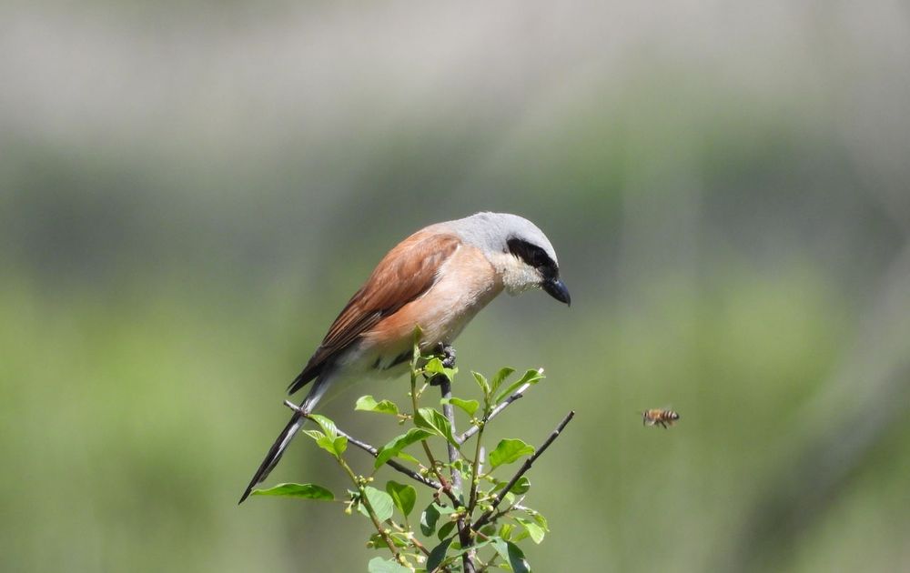 De Grauwe Klauwier vangt regelmatig Hommels en Wespen tijdens hun vlucht uit de lucht. Prachtig schouwspel. Op grote afstand met veel geluk gefotografeerd.
