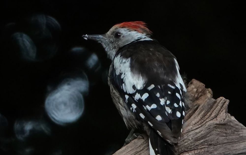 In the spotlight: de middelste bonte specht, mijmerend bij de bokeh-bollen.