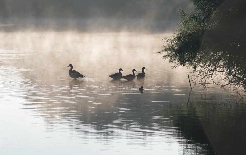 Deze foto heb ik genomen heel vroeg in de ochtend. Vandaar de damp boven het water. Wat ik zelf zo indrukwekkend vind is alsof het lijkt dat de damp deze eenden omringt. "De vroege bescherming"
